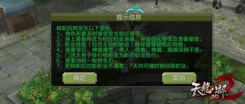 可在姑苏NPC“转职”处变更为其他工作,转职后人物形象、身上的装备、时装、技术等都将相应转化,宝石、美人、侠客、神装特点、神翼、暗器等将坚持不变。