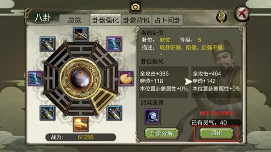 除了花費元寶占蔔,現在還能夠經過主題月活動積分換購【占蔔銅錢】和【天降雨澤禮盒】獲取卦象,分化強化的好機會千萬別錯過了!需求耗費同名、同卦位強化0卦象。      與卦位強化不同,每個卦象最高能強化到9級,卦位強化是永久的,不管妳怎麼替換卦位上面的卦象,卦位的特點加成都是不會變的,能夠說是很劃算了!71萬卦盤,妳也能夠擁有。      卦位強化除了能提高卦位本身特點以外,還能給自己卦位上的卦象帶來加成,這種又當輸出又當輔佐的感覺,真是太棒了!卦盤強化有幾個特別等級能夠提高加成作用,不同等級需求耗費的靈氣如下。      卦盤前期強化很容易,收益也不錯,所以剛開始沒有湊齊自己心儀卦象的時分,優先考慮強化卦位也是不錯的選擇!除了卦位,已裝備的卦象也能夠進行強化操作。點擊【卦象】→【強化】,點擊【強化】,卦象也就晉級了!